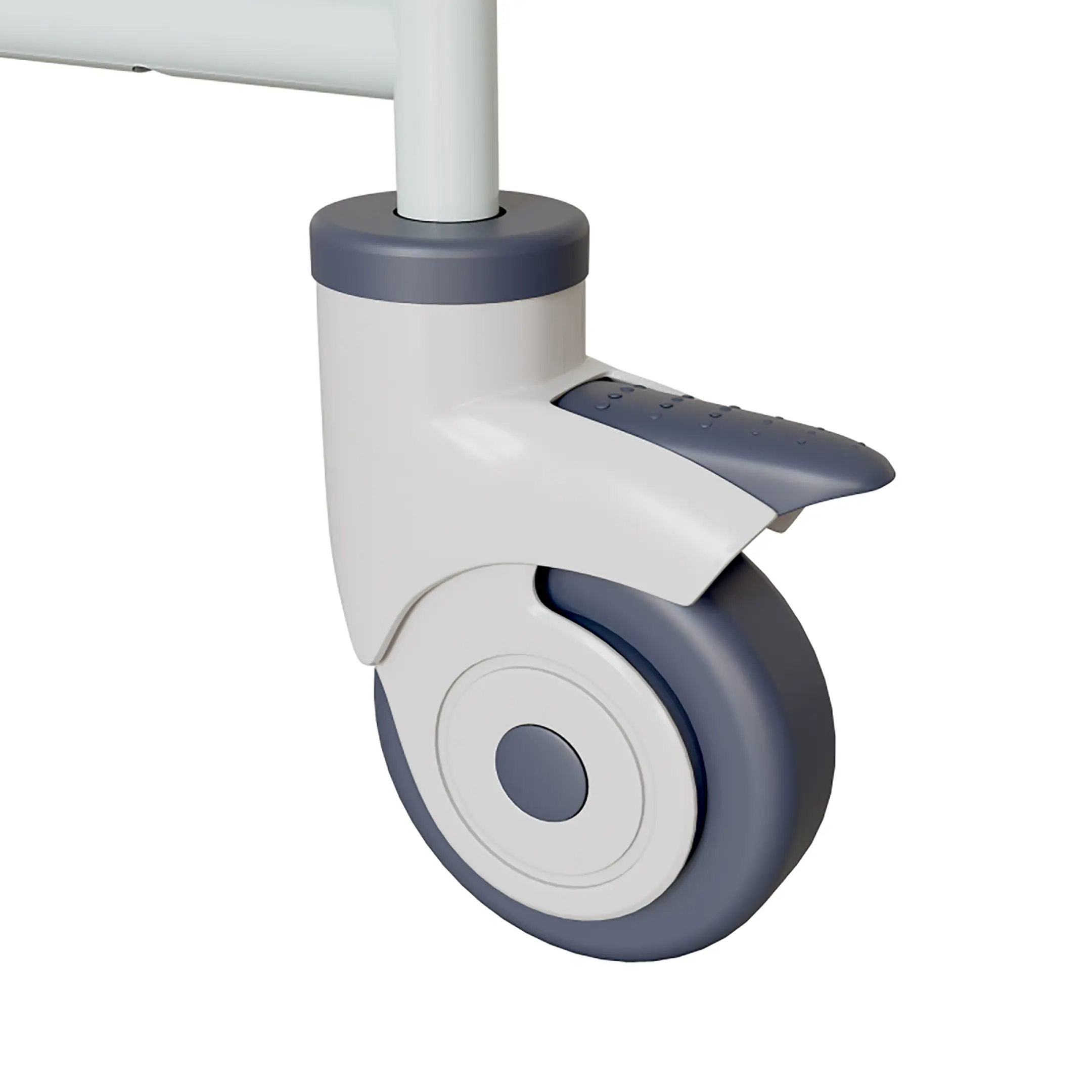 • колеса кровати поворотные, самоориентирующиеся, диаметром 100 мм, комплекующиеся надёжной стальной вилкой с прецизионным радиально-упорным подшипником, ободом из полипропилена и шинкой из серого полиуретана, не оставляющего следов на полу (два колеса – с индивидуальным тормозным устройством);