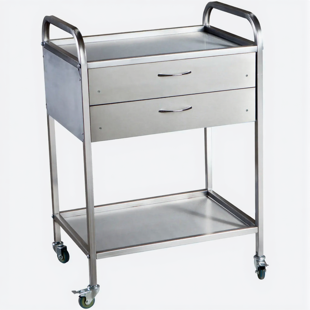 Стол медицинский инструментальный СМИ-02-02 (полки нерж., колёса пластик) — это компактная передвижная тумба, предназначенная для размещения инструмента, лекарственных препаратов и приборов в медицинских учреждениях и лабораториях. Модель имеет каркас из профильной стальной трубы, два выдвижных ящика и верхнюю полку из нержавеющей стали.