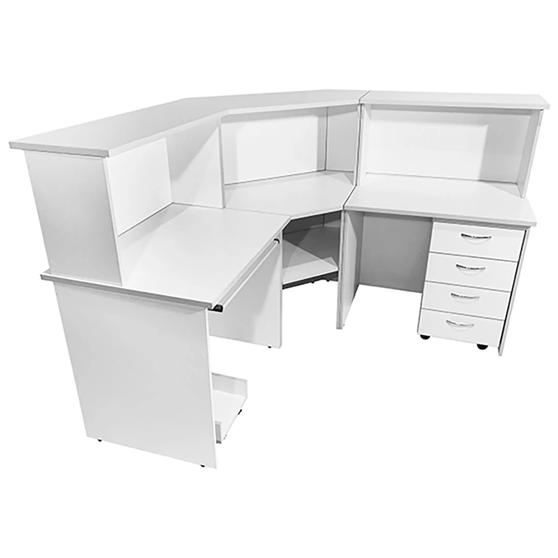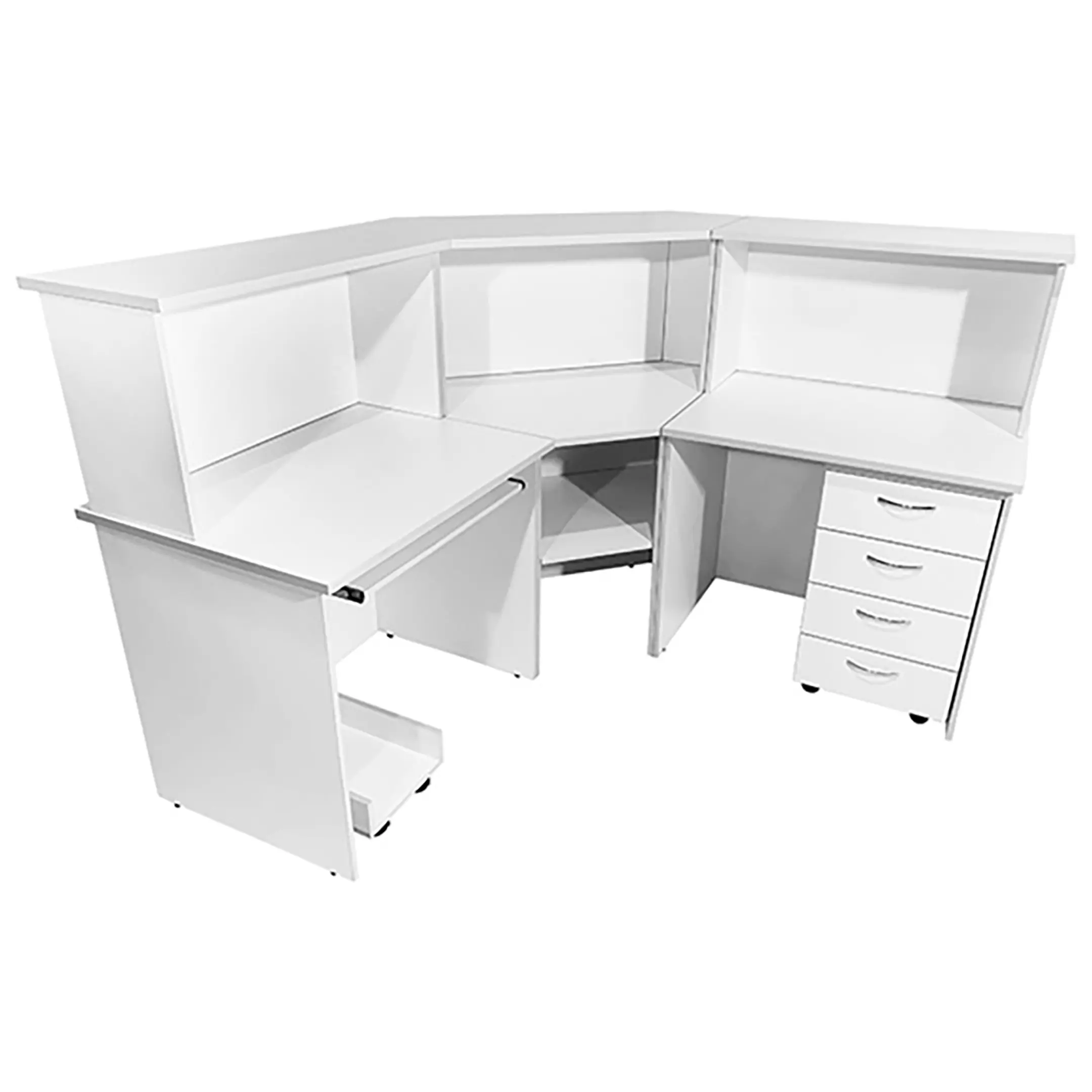 Стол-пост медицинский MD СтП 11.01 (белый) — это надежное и функциональное угловое решение для создания удобного рабочего места администратора в медицинских учреждениях. Модель выполнена из ЛДСП, имеет надстройку сверху, нишу под угловой столешницей, платформу для системного блока, полку для клавиатуры слева и тумбу с четырьмя выдвижными ящиками.