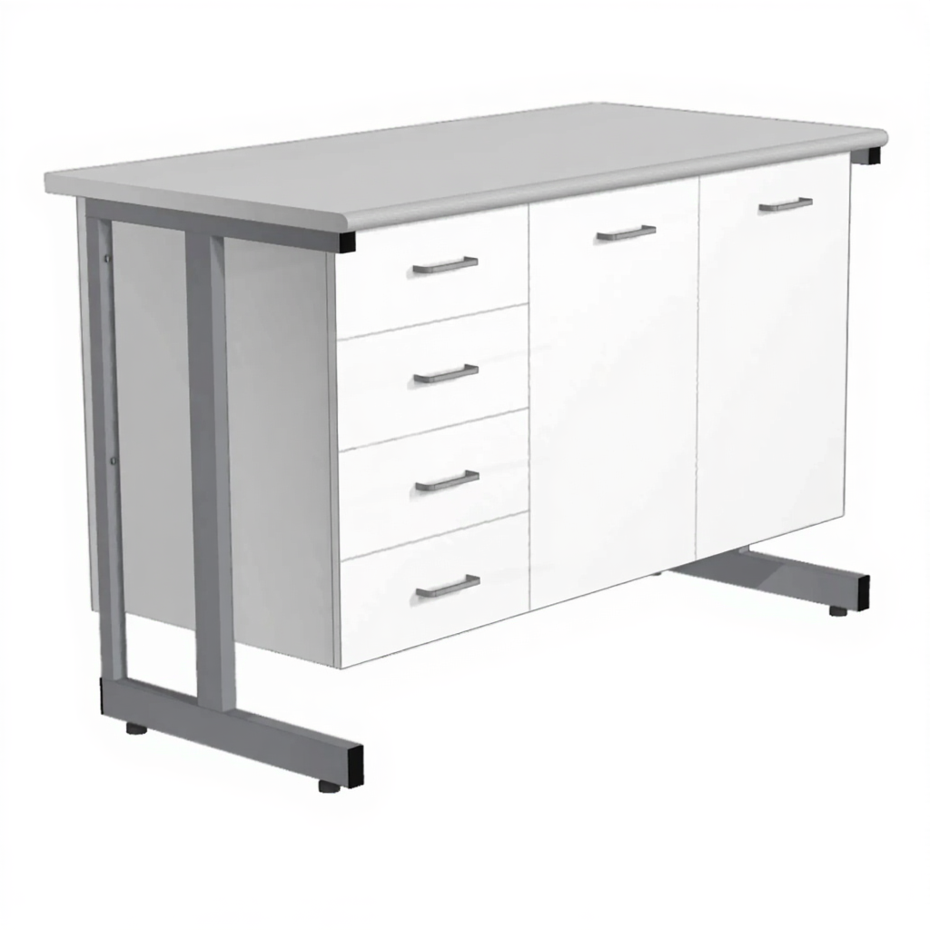 - Комбинированная система хранения — тумба из ЛДСП 16 мм с кромкой ПВХ включает левую секцию с 4 выдвижными ящиками и правую секцию с двумя дверками и внутренними полками. Возможно изготовление тумбы из металлического листа толщиной 1 мм.