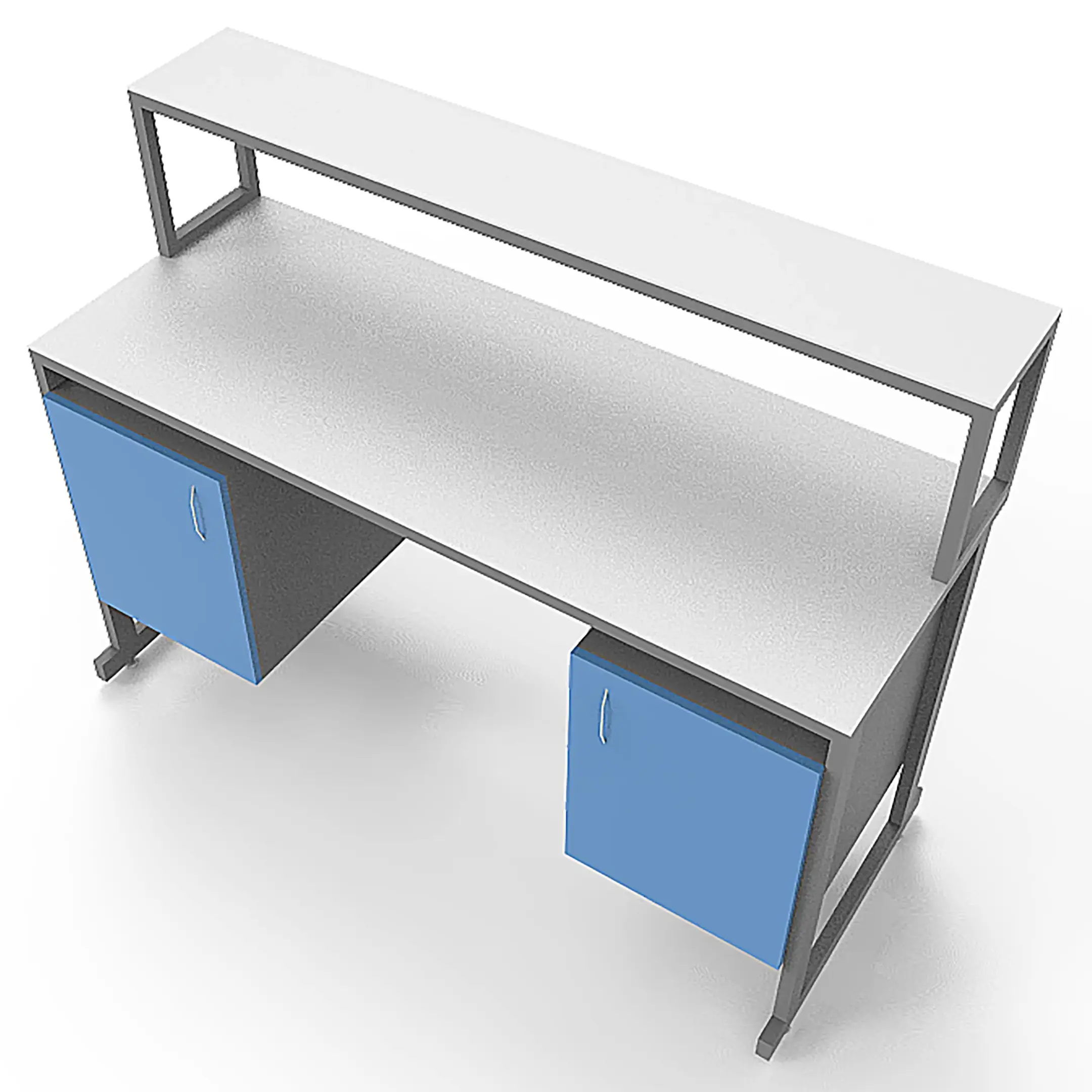 - Удобная система хранения — две тумбы под столешницей с дверцами для хранения материалов и оборудования, надстройка с полкой.