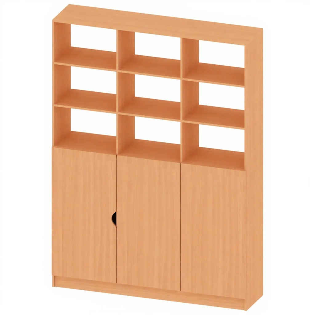 - Комбинированная конструкция — верхние открытые ячейки для быстрого доступа к часто используемым пособиям и нижнее закрытое отделение для хранения материалов, требующих защиты.