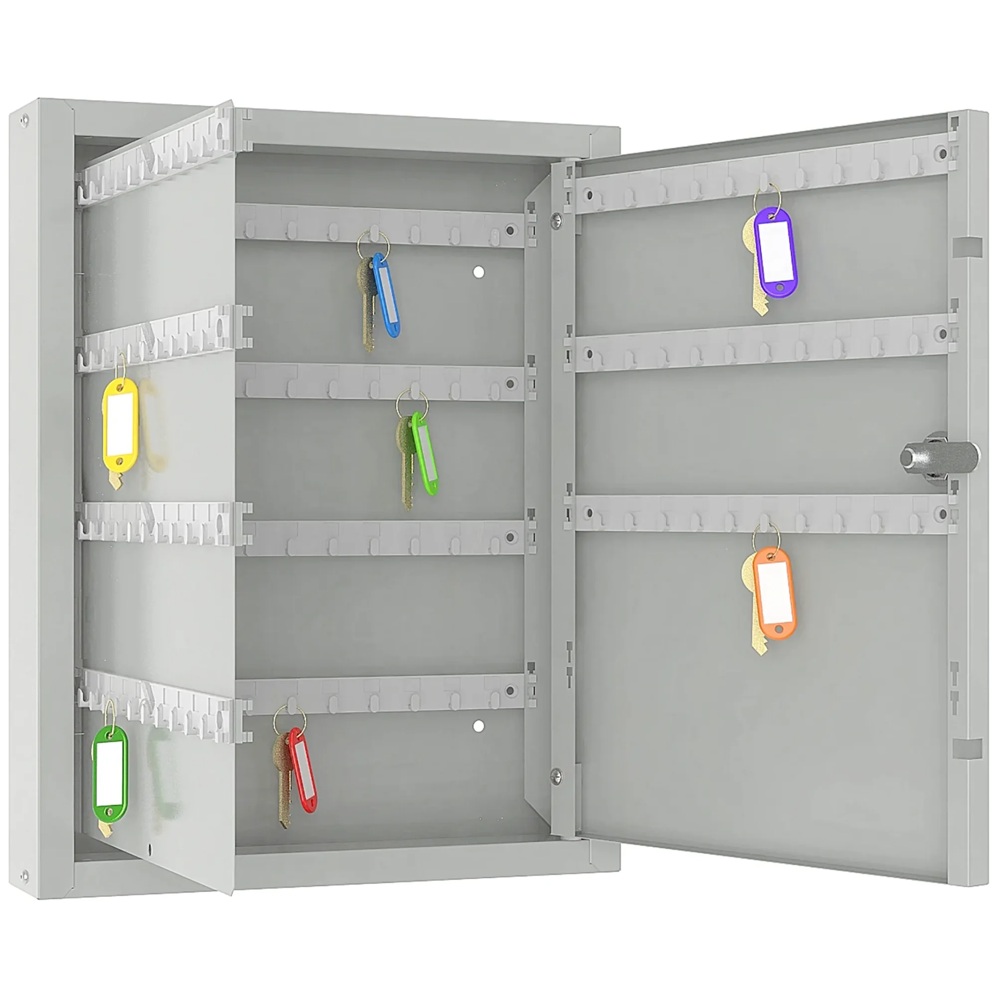 - Удобство эксплуатации и эргономика — модель, как правило, спроектирована с учетом удобства работы: панели с крючками могут быть статичными или выдвижными, обеспечивая отличный обзор и легкий доступ ко всем ключам. Комплектные брелки упрощают манипуляции, экономя время персонала.