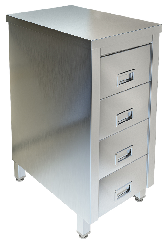 Корпус и четыре выдвижных ящика из нержавеющей стали марки AISI 430 толщиной 0,8мм.