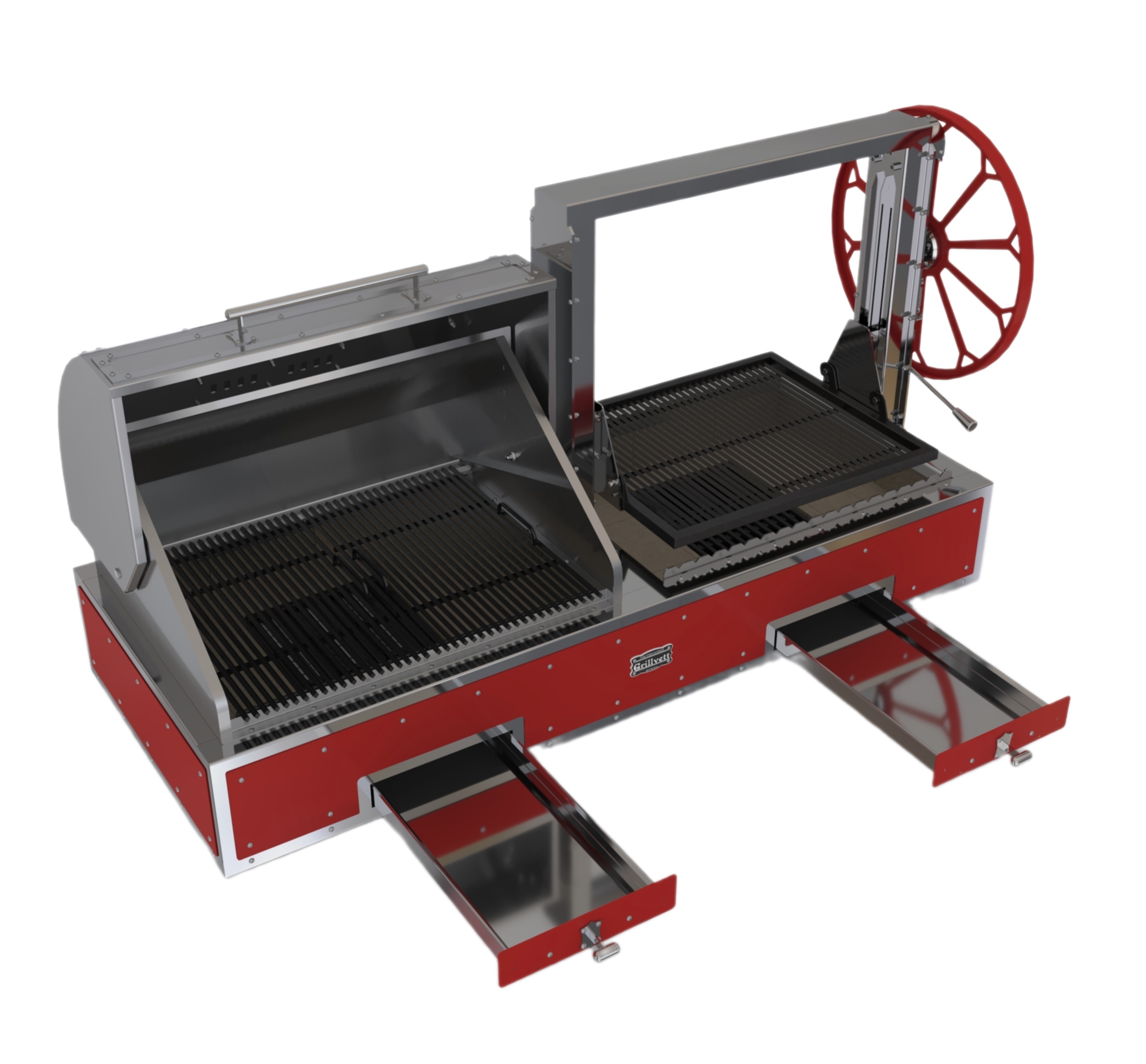 - Две рабочие зоны — решетка-гриль с механизмом подъема над очагом и зона копчения/томления с крышкой-смокер.