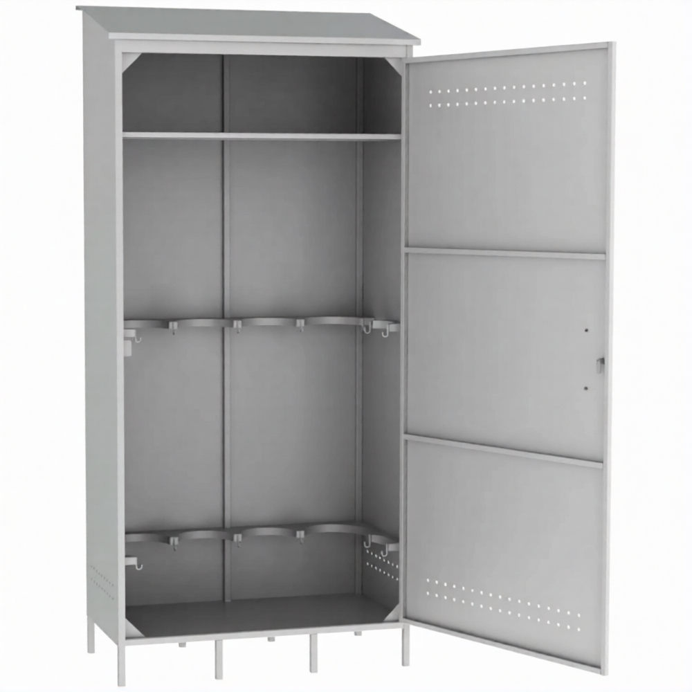 - Вертикальная компоновка для экономии площади и большая вместимость — шкаф предназначен для хранения до шести баллонов в стоячем положении. При ширине всего 1150 мм он позволяет компактно разместить значительный запас газа, что идеально для помещений с ограниченной площадью, узких проходов или угловых зон, где горизонтальные шкафы не поместятся.