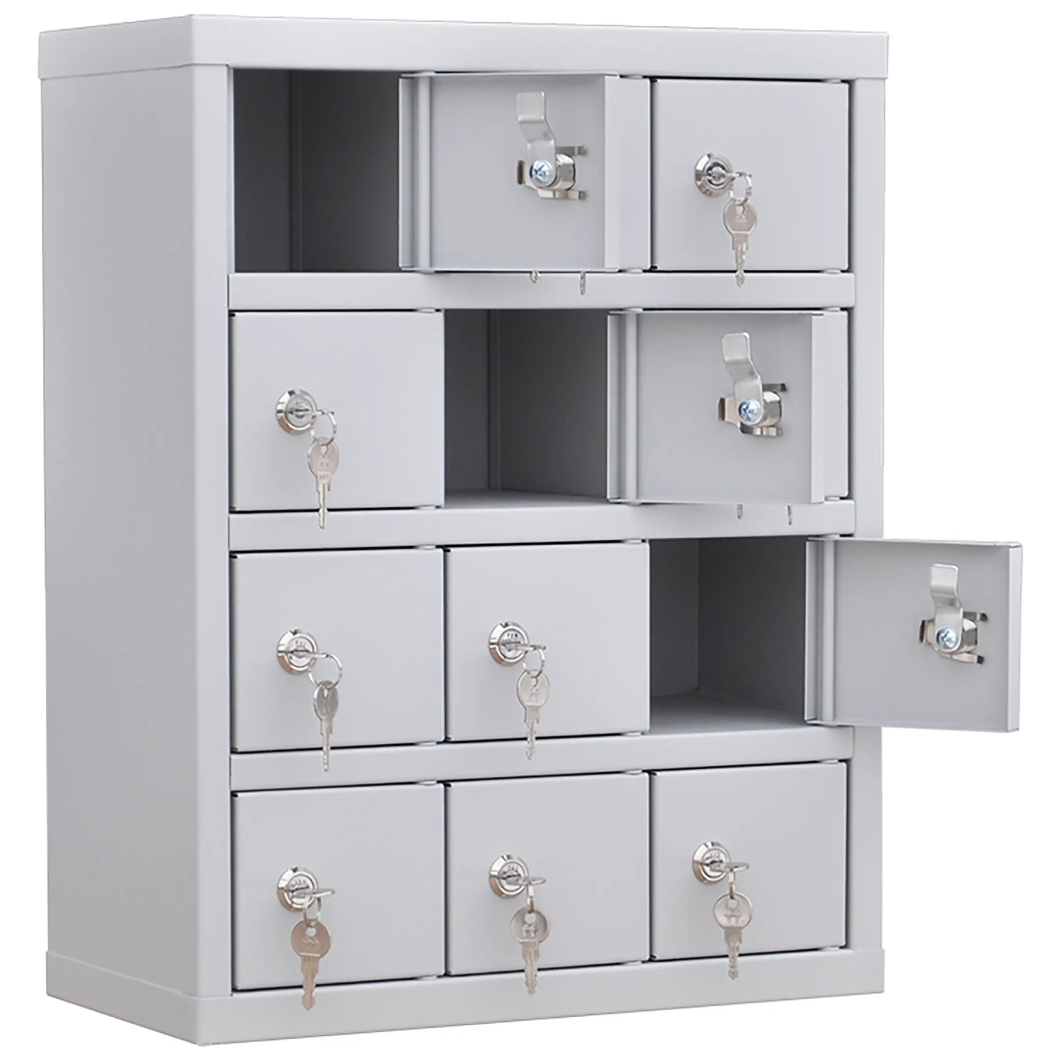 - Компактные размеры и базовая вместимость — шкаф предоставляет 12 индивидуальных запирающихся ячеек, что оптимально для малых коллективов, таких как группа продленного дня, отдел из нескольких сотрудников или спортивная секция. Его небольшие габариты позволяют легко разместить оборудование на столе, полке или тумбе, не занимая много места.