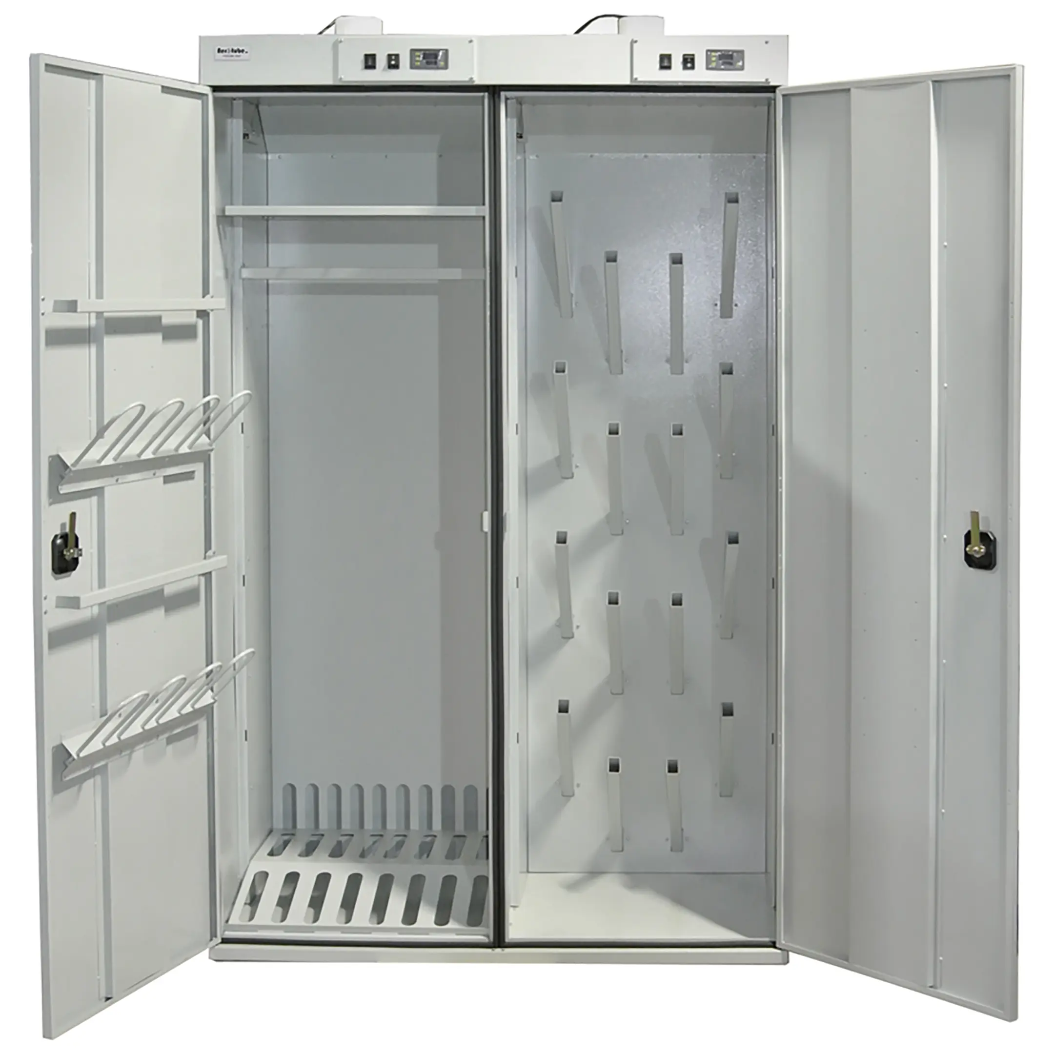 - Компактность и универсальность — шкаф предназначен для одновременной сушки как одежды (спецодежды, спортивной формы), так и обуви. Его оптимальные габариты позволяют разместить оборудование в помещениях с ограниченным пространством, таких как небольшие раздевалки, кабинеты персонала или учебные классы, не теряя в функциональности.